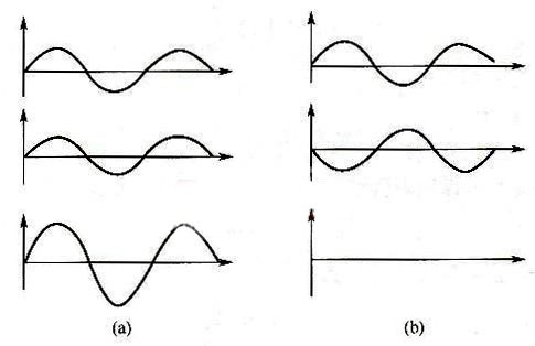 ((a) represents the superposition of sound waves, (b) represents the cancellation of sound waves)